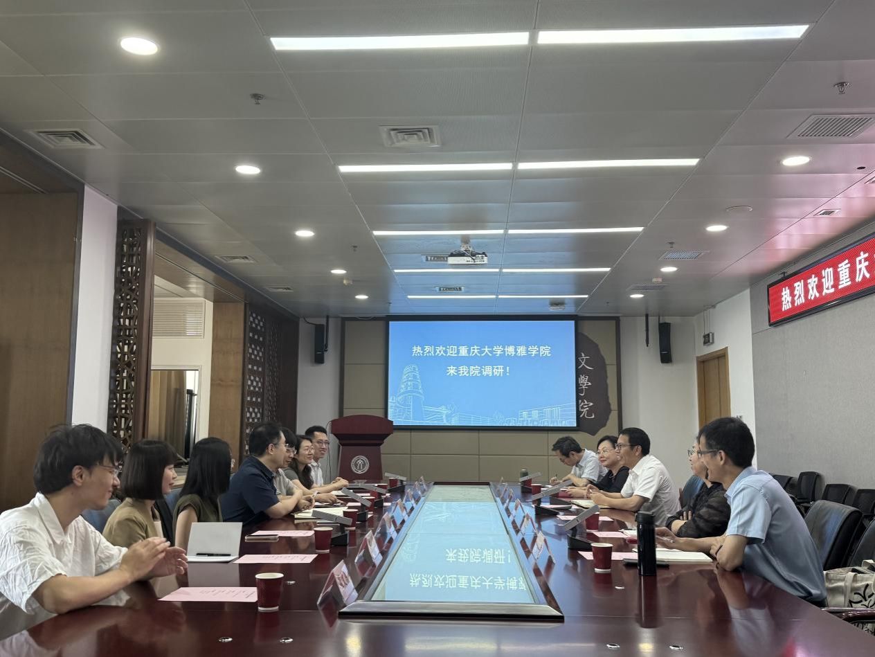 院长陈剑澜、党委书记颜梅、副院长杨庆祥、常培杰、副书记康凤座谈交流。双方首先介绍了两校中文学科的历史源流和发展状况,随后围绕科研活动的组织与管理、人才体系的建立与完善、学科特色的凝练进行了深入探讨。