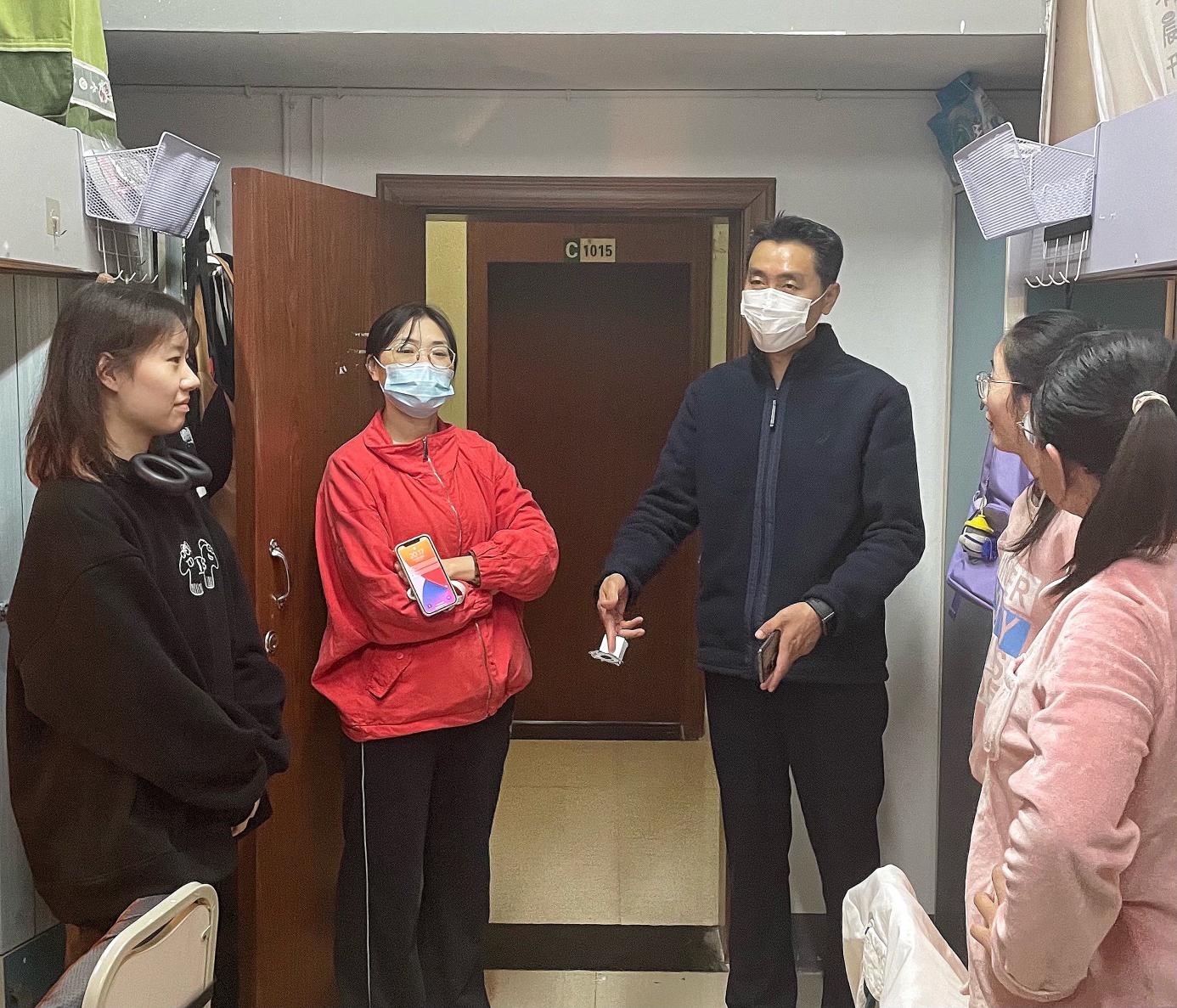 在走访过程中,老师们仔细观察了解了同学们的宿舍生活环境,并就宿舍安全卫生等问题提出了建议。曾佐伶指出,宿舍作为现阶段同学们学习、生活的场所,更应该注重舒适度与安全性,建议同学们勤通风、多打扫,保证寝室的干净与整洁。姜雪峰则建议同学们注意用电安全,希望同学们都能有一个便捷、舒适、安全的学习环境。此外,老师们提醒同学们务必做好个人防护,物资方面如有欠缺请及时向ag百家乐官网