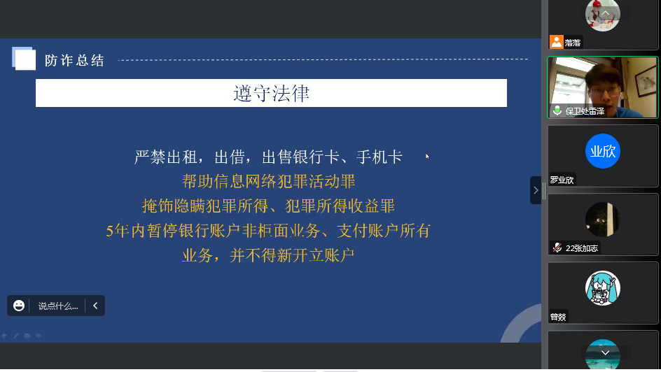 在线上举办了安全教育月反诈知识专题讲座。本场讲座以“平安是最大的智慧”为主题,邀请我校保卫处雷泽老师主讲,由本科生辅导员高宏佳老师主持。ag百家乐官网