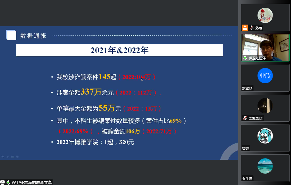 雷泽老师以近两年我校涉诈骗案件的统计数据为导入,分析了我校网络电信诈骗发案数量、涉案金额整体均呈下降趋势,但本科生被骗案件数量占比仍然较高。同时,他指出新型网络犯罪已经成为广发于社会面的主流犯罪,呈现出诈骗手法加速迭代变化、攻防对抗不断加剧升级等特点,提醒同学们务必时刻保持警惕,切实维护自身财产安全和合法权益,保证不被骗才是最好的解决办法。