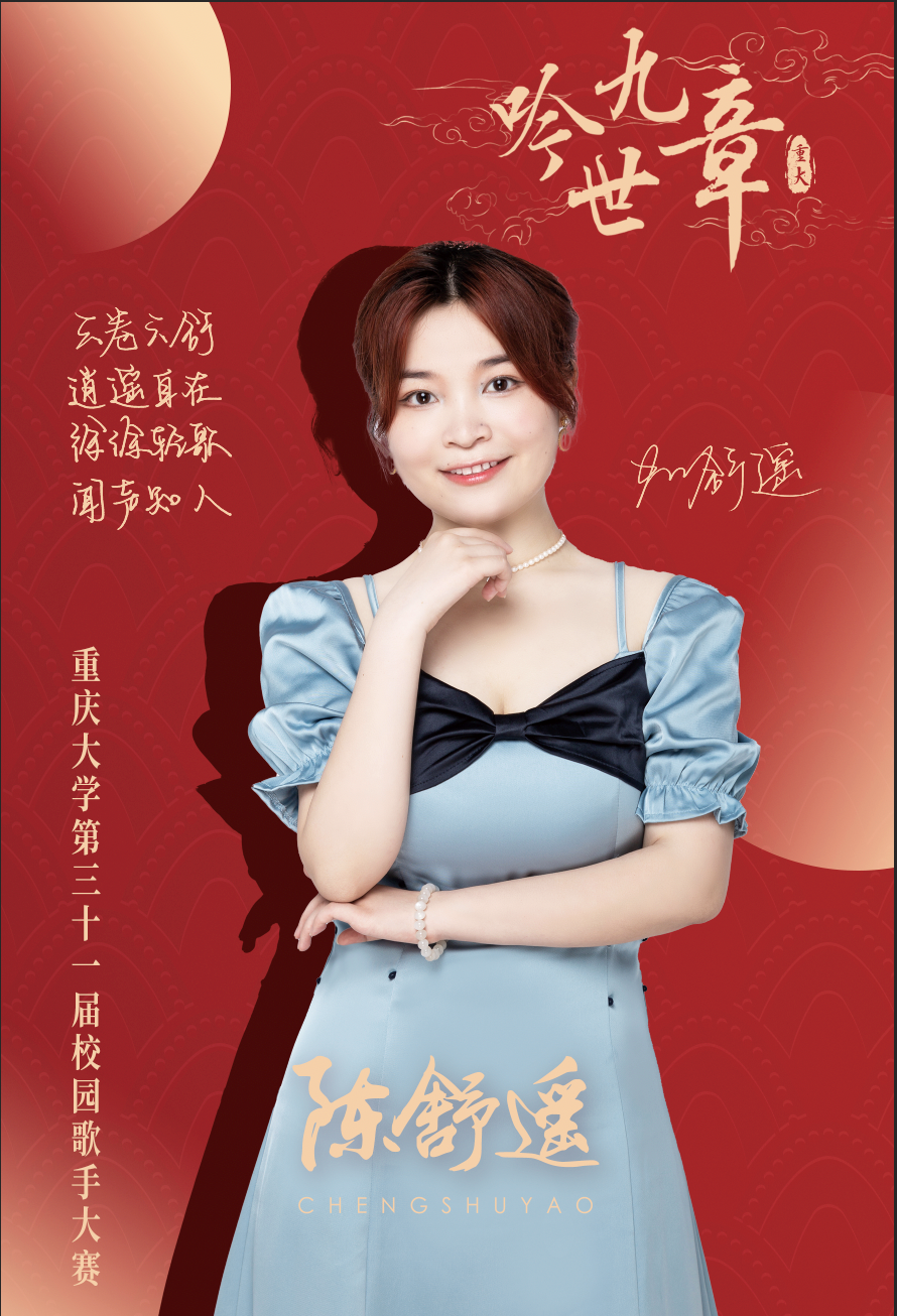 陈舒遥同学在本科期间就凭借极其优秀歌唱能力和表现力荣获了海南大学“歌后”的美誉。进入重庆大学后,她在校园歌手大赛的舞台上一路披荆斩棘,在两轮激烈的比拼后,用亚军的成绩证明了自己。在第一轮比赛中,陈舒遥同学演唱了谭维维版的《乌兰巴托的夜》,她表示选择这首歌是因为当初第一次听到这首歌就被深深打动;作为王菲粉丝的她在第二轮演唱了王菲的《如愿》,她表示选择这首歌是因为它用诗意的比喻将几代中国人的奋斗与传承娓娓道来,很有意义。