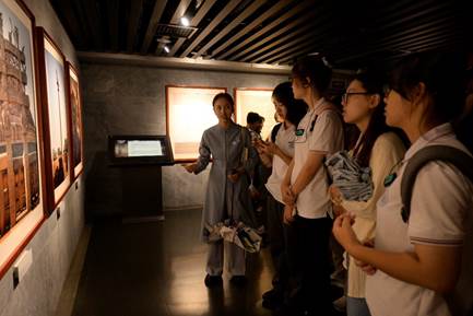 在初步感受大足石刻的特色后,讲解员为同学们进一步讲解了佛教东渐与道教传播发展的过程及其代表性文化遗址,尤其是石窟建造的历史,从而引出了大足石刻所特有的多教并存、儒释道三教合一这一鲜明特征。同学们跟随讲解员的脚步循序渐进地了解了大足石刻的历史,清晰地感受到大足石刻作为宗教彻底世俗化标志之一的重要历史文化地位。