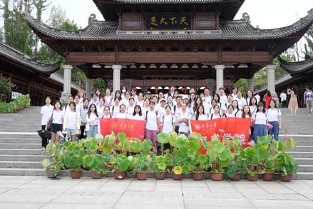 老师同学们在“天下大足”阁楼与祈福殿前合影留念