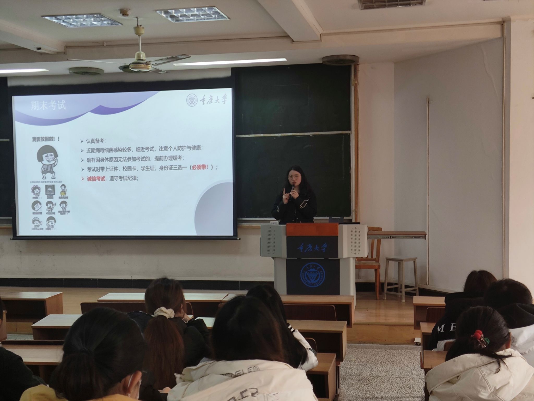 在会议上,高宏佳首先宣布了元旦假期的放假安排,告知同学们离校需请假,提醒同学们在享受假期的同时要注意保护个人安全。面对即将开始的期末考试,她提醒同学们认真备考,诚信考试,并按要求携带个人证件参加考试。