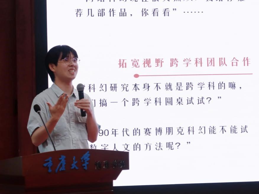 在嘉宾分享环节,童博轩以“我们的科幻世界”作为主题,结合自己的个人研究经历谈当下青年科幻学术社群,重点讲述了他参加重庆大学“科幻文学与科技人文”学术集群、“四十二史”团队、《科幻人文》团队以及中文科幻学术工坊等青年学术社群中的收获,并从砥砺思想激发问题意识、获得研究材料等方面的支持、拓宽视野跨学科团队合作、融入青年学术共同体等四个方面分享了青年社群的优势。