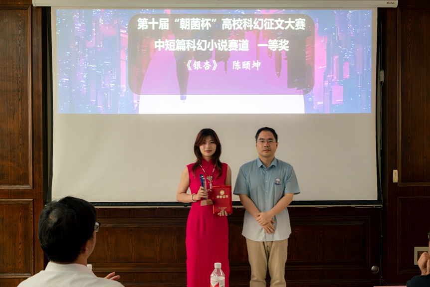 最后揭晓的奖项是“朝菌杯”最具分量的“中短篇科幻小说赛道”的获奖情况。柏毅恒为中短篇入围奖的获奖者们颁奖,第十届“朝菌杯”高校科幻征文大赛组委会秘书长张博傲为中短篇三等奖的获奖者们颁奖并宣读颁奖词,刘洋老师、萧星寒老师分别为中短篇二等奖的两位获奖者颁奖并宣读颁奖词。在颁奖环节的结尾,“朝菌杯”中短篇科幻小说赛道的头奖终于被公布:来自吉林财经大学的陈颐坤凭作品《银杏》荣获本届“朝菌杯”中短篇一等奖,李广益老师为其颁奖并宣读颁奖词。