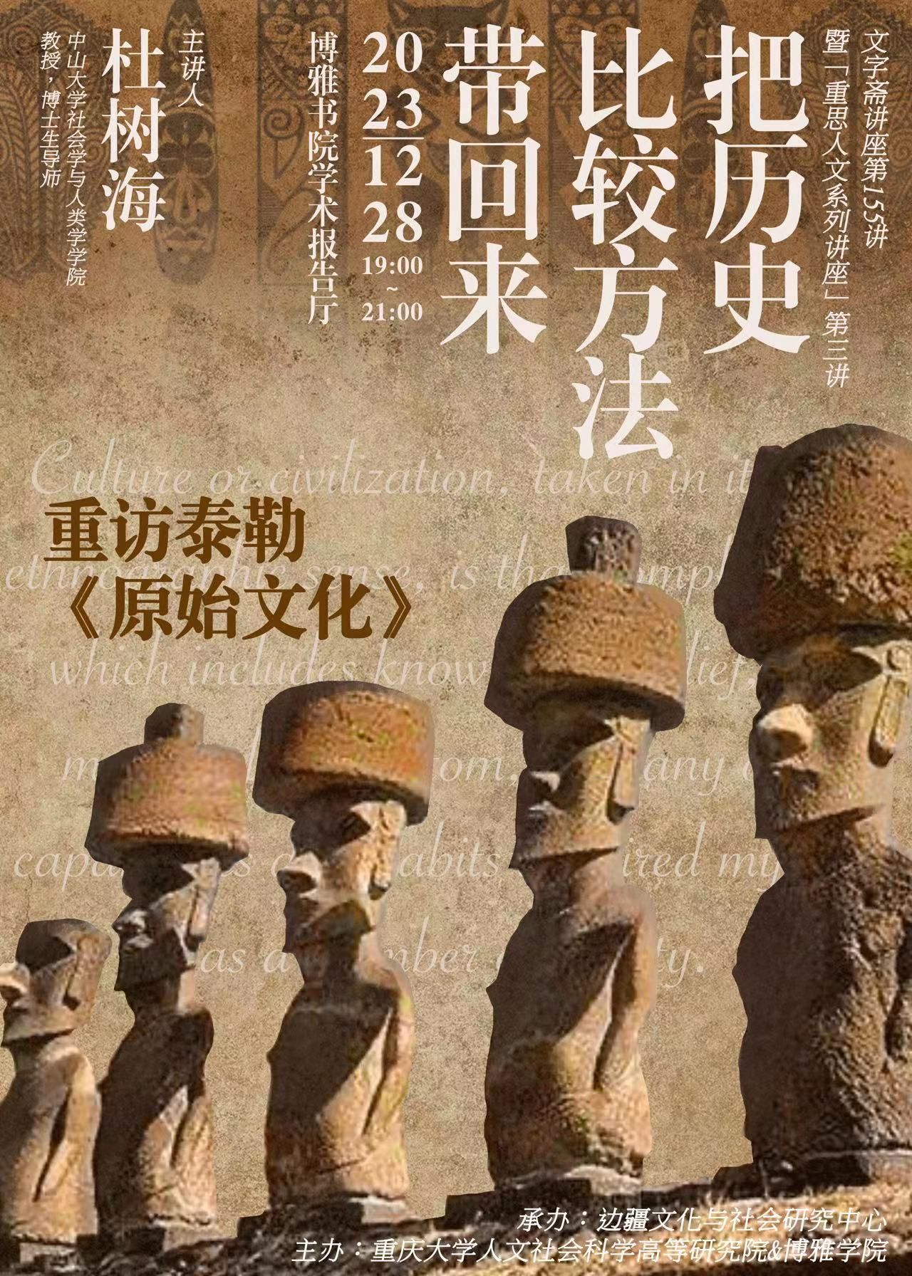 《原始文化》是英国著名人类学家、“人类学之父”爱德华·泰勒的重要著作,其提出的文化概念、跨文化比较方法,在当时具有广泛的影响力。在该著作出版后不久便被引入中国,对20世纪初中国的民族学、文学、民俗学的发展产生了深远影响。但时过境迁,此书现在更多时候只为学者列举“文化”一词的概念时,简单征引。本讲座将结合人类学、历史学以及文化研究相关学科的中国实践,重新审视泰勒提出的“遗存”“万物有灵”“寰宇可比性”“文化”等概念,并分析其对我国民间文学、文化研究、神话史诗等相关领域的启发意义。