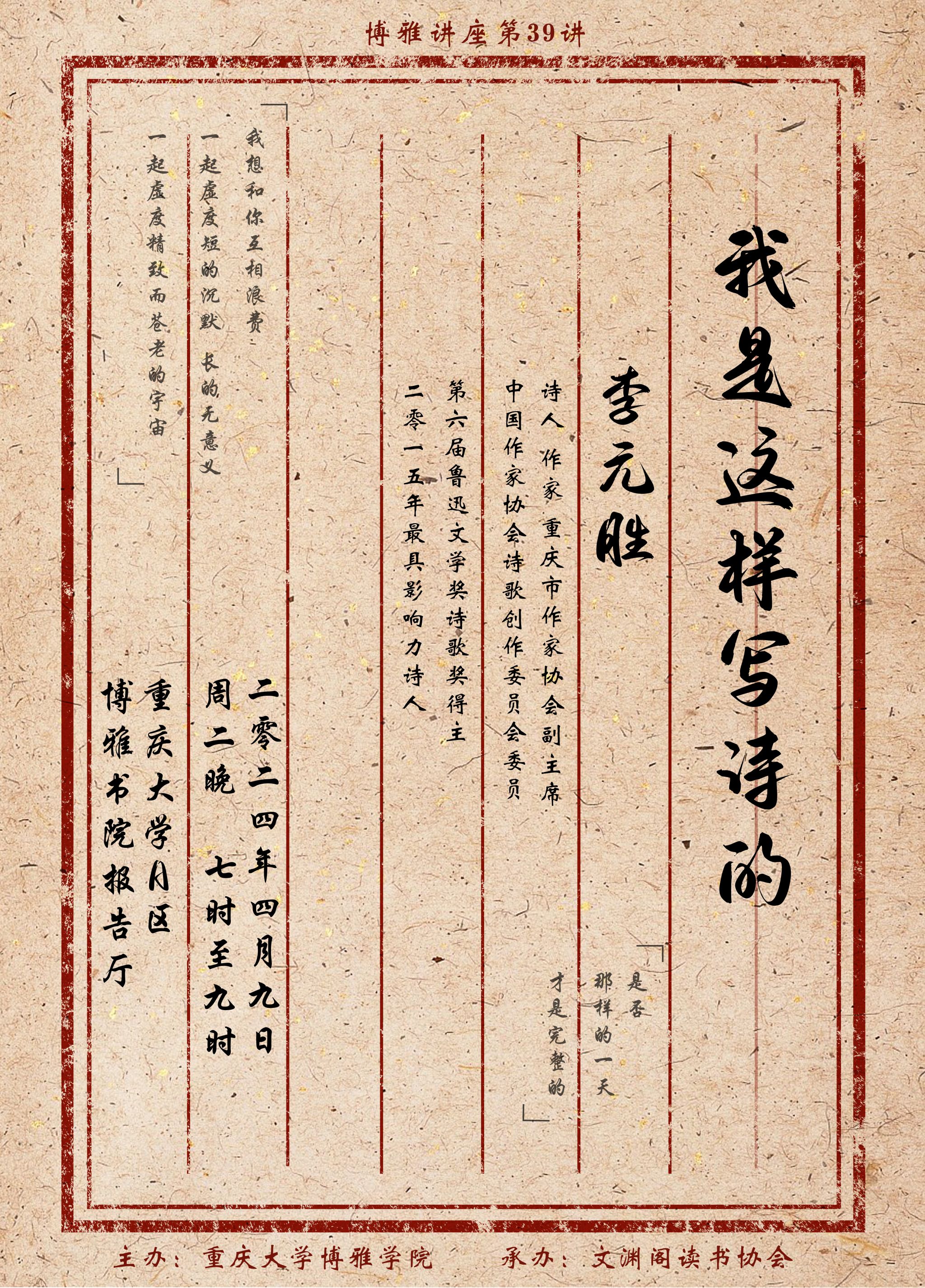 诗歌创作作为文学中最神秘莫测的体验,往往很难为外人道,本次讲座诗人李元胜将为我们揭开诗歌创作的神秘面纱,并结合《青龙湖的黄昏》《我想和你虚度时光》《玛曲》《黄河边》等作品,将自己的创作经验及幕后故事娓娓道来。