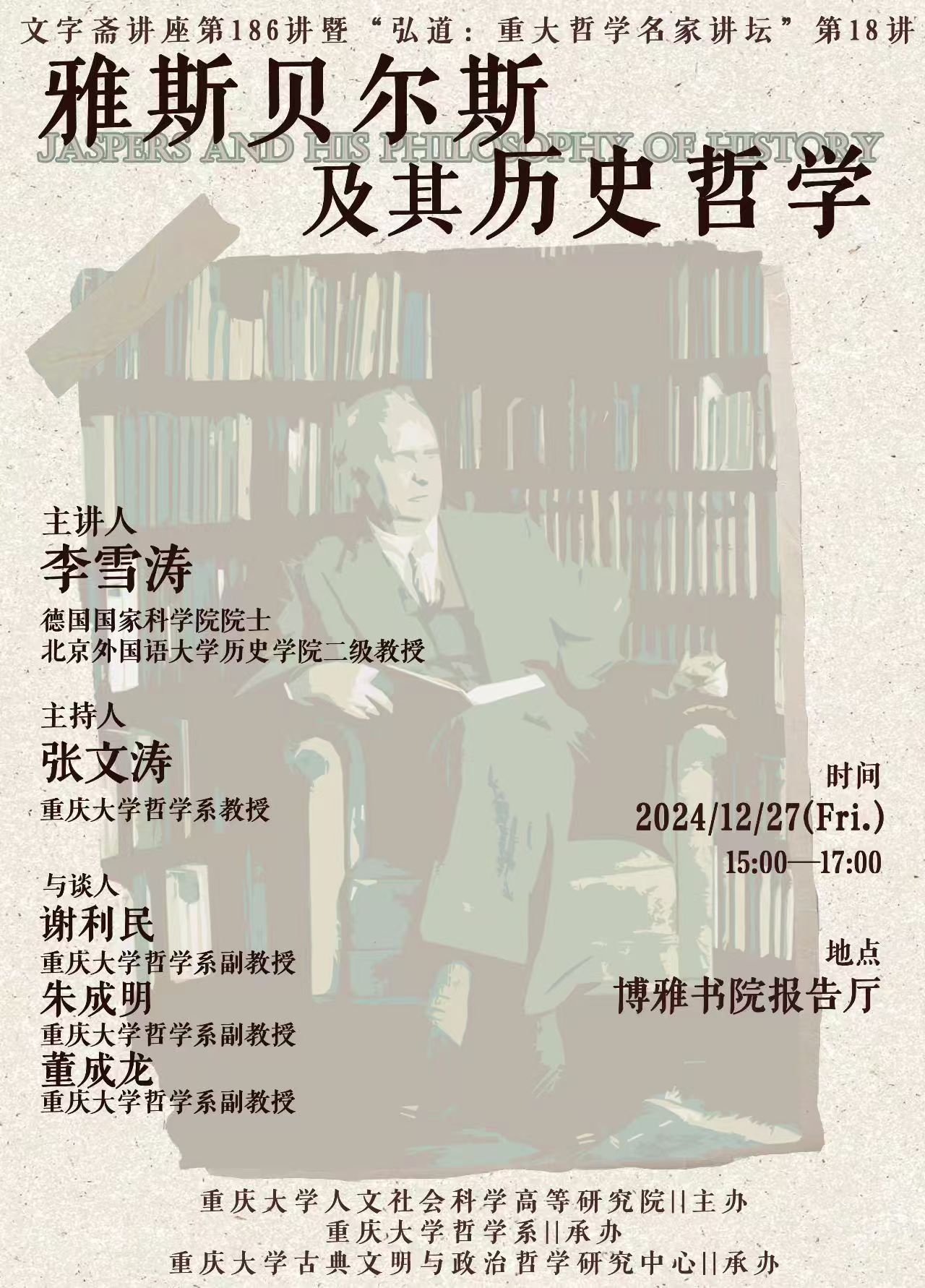 本讲座将介绍《雅斯贝尔斯著作集》的翻译缘起,讲解雅斯贝尔斯的学术经历,从“轴心时代”等核心概念出发,梳理雅斯贝尔斯历史哲学中的“去欧洲中心论”思想,及其对理解世界历史中的交往理性、世界哲学与普世哲学区分的意义,彰显《论历史的起源与目标》在德国历史哲学谱系中的独特价值。