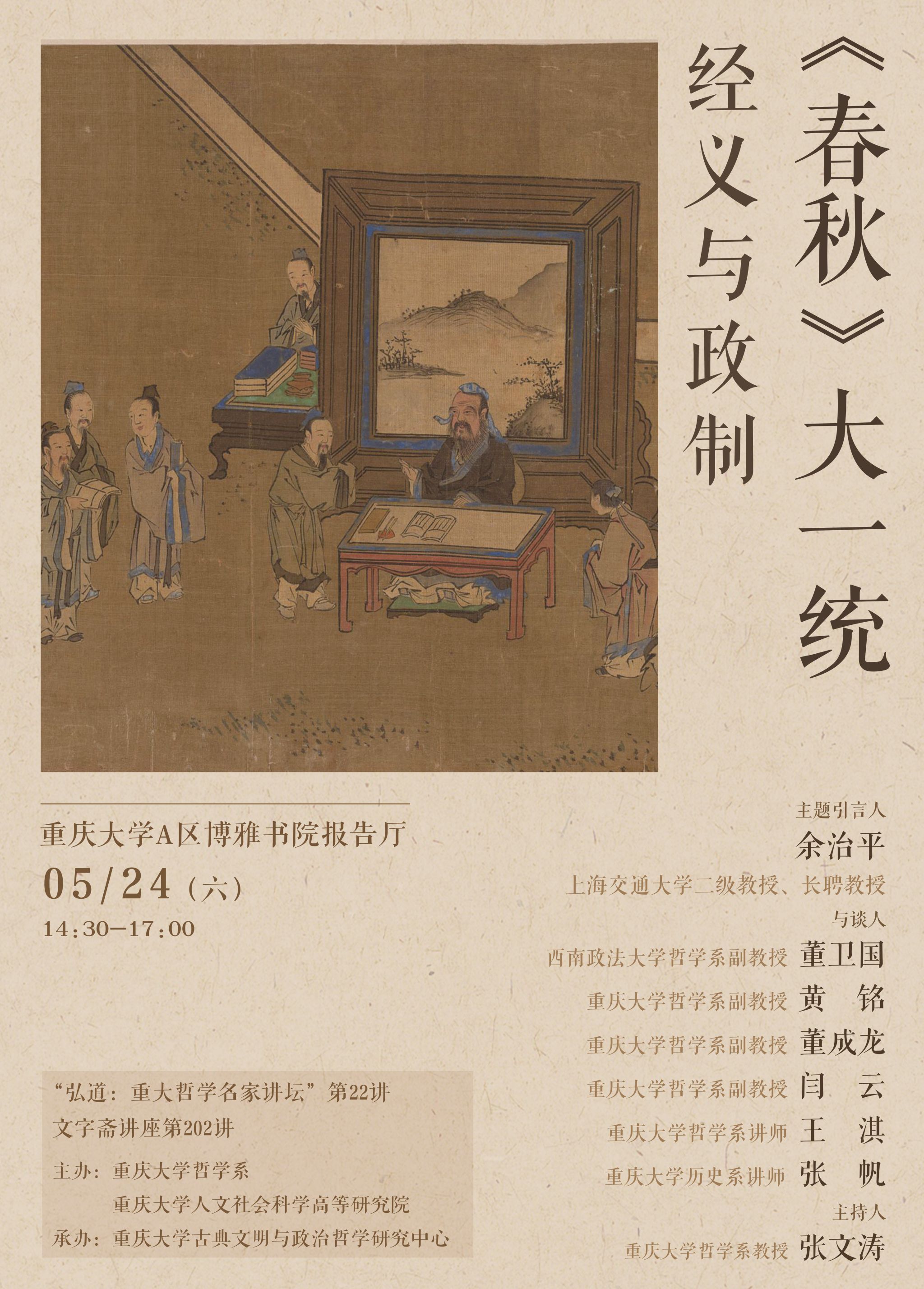 extend1 【文字斋讲座】《春秋》大一统:经义与政制 extend2 主题引言人:余治平(上海交通大学二级教授、长聘教授)