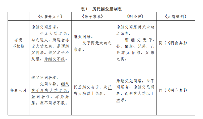 由上可见,《大唐开元礼》彻底贯彻了单向的逻辑,首先,明确表明“为继父不报”,则继父有服,继子无服。其次,在异居的认定上,也只规定了继父有子,而不包括继子有子。很显然,这是继父施恩,继子服丧的模式。另一方面,经典的本旨也会持续的影响到制度,所以在《朱子家礼》中,异居关系的认定回归到了双向,认为“继父有子,己(指继子)有大功以上亲者”都算异居,《明会典》《大清律例》皆言“两有大功以上亲者”,都延续了《朱子家礼》的逻辑。