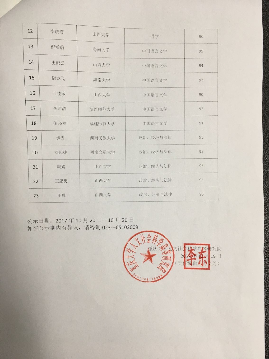 重庆大学人文社会科学高等研究院2018年推免研究生拟录取名单公示