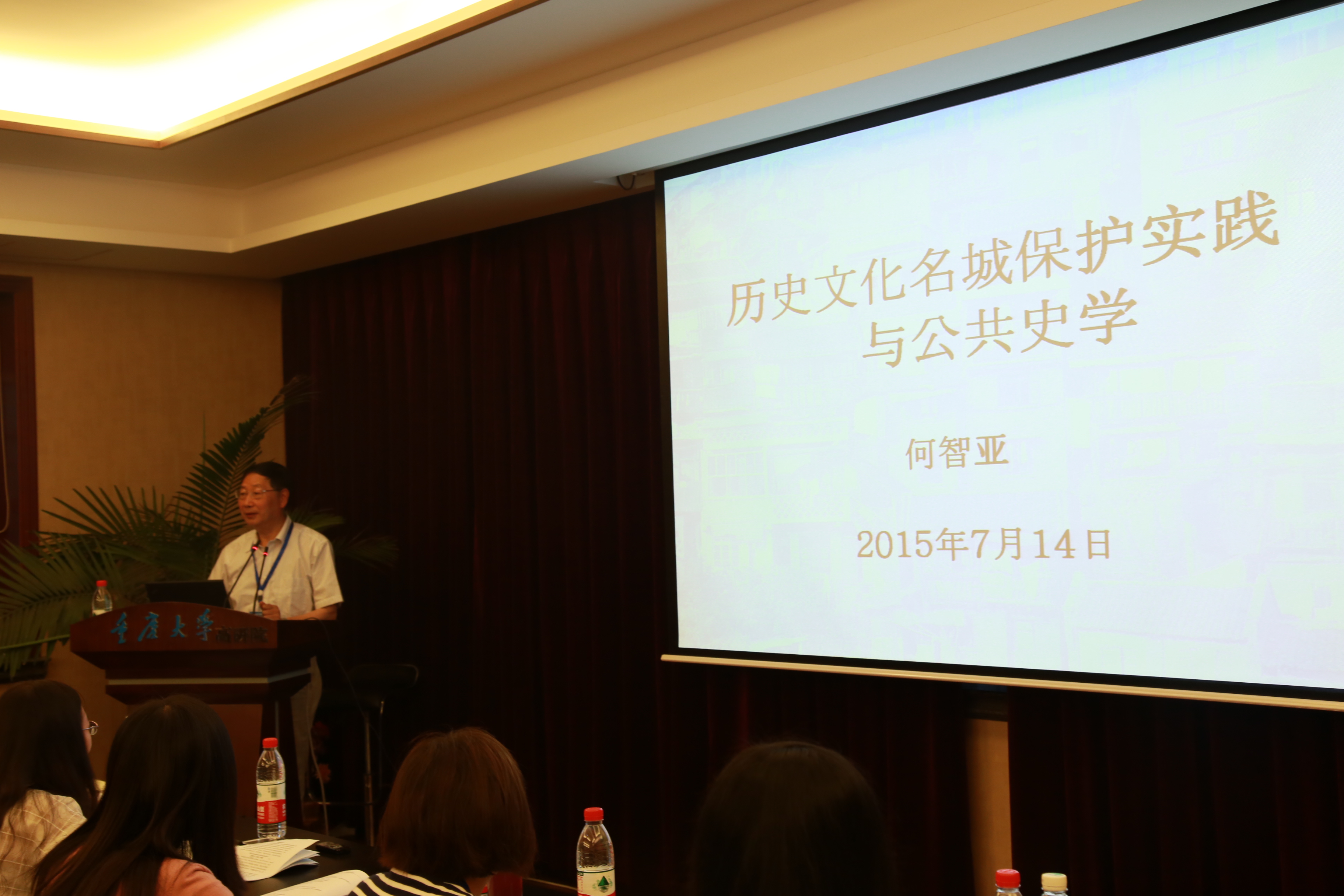 在全体人员合影留念之后,重庆历史文化名城专业学术委员会主任、重庆大学客座教授何智亚为营员们带来了一场题为“历史文化名城保护实践与公共史学”的专题讲座。讲座中,何智亚教授为同学们讲述了重庆的历史文化以及古建筑遗址,并结合他自己曾经参与过的如重庆著名文化旅游景点洪崖洞的景观设计和文化遗址保护等实践活动,向同学们解释了历史文化名城保护实践与公共史学研究之间的关系。在提问交流环节,营员们就文化遗产保护与旅游开发、文艺遗产保护的公众参与等问题与何智亚教授进行了交流和探讨。