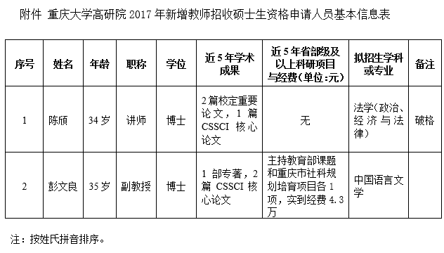 附件:重庆大学高研院2017年新增教师招收硕士生资格推荐人员基本信息表