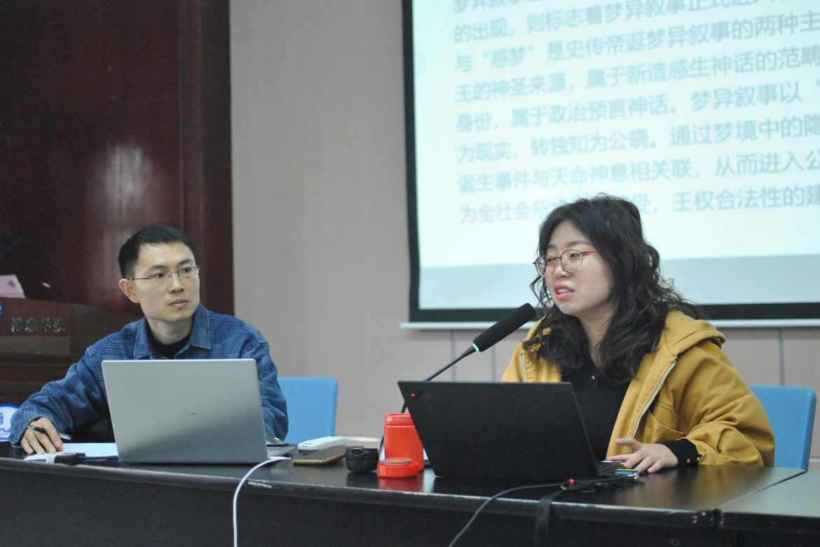 在随后的与谈环节中,两位与谈人董涛副教授和王瑞静副教授先后发言。董涛老师立足史学研究视角,从政治势力角逐、官方治理与历史书写等方面分享了自己的体会,高度肯定了刘光洁老师研究视角的创新。王瑞静老师则以中西对比视角为切入点,在中西“梦异叙事”对比中提出了自己的疑惑与见解,指出社会共识应该是“梦异叙事”中起关键作用的一部分,要以梦的社会文化属性来分析“梦异叙事”。刘光洁老师一一回应,交流非常充分。