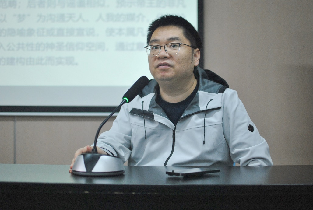 在主题分享环节,刘光洁老师在对选题缘起和研究立场进行了简要阐述后,围绕“梦进入史传帝诞神话的历史发展脉络”“史传帝诞梦异叙事中的两种不同类型”以及“梦成为王权合法性建构工具的原因”三个部分展开详细解读。刘老师首先指出“梦”经历了“殷商-商周易代之际-春秋-两汉”四个历史阶段后,从最初的自在之物发展为一种象征符号,参与到王权合法性建构当中,成为论说王权合法性的工具,“梦异叙事”也作为独立完整的叙事单元进入正史帝王诞生的历史叙事中。在梳理完历史脉络并对“感生”“身感”和“意感”等概念进行严格界定后,刘老师结合具体实例为我们分析“梦异叙事”中的两种不同类型,即“新造感生神话的‘梦感’叙事”和“政治预言神话的‘感梦’叙事”。刘老师率先对前者在“感生”方式和“感生物”上的新变化进行解读,随后又从结构类型角度对后者加以爬梳,事例丰富,论述详实。在分享的最后,刘老师指出,梦自身兼具客观性、经验性与神秘性、虚幻性的特点,以及梦占知识世俗化、常识化的发展,使得本属凡俗的个人事件与天命神意相关联,进入公共性的神圣信仰空间,最终成为王权合法性建构的工具。