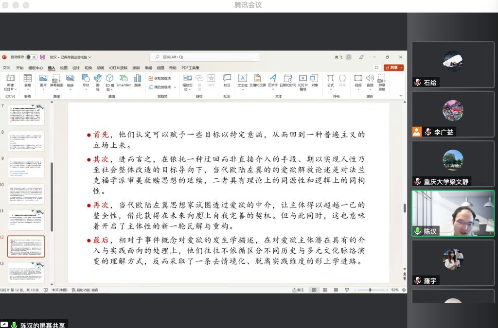博士候选人陈汉做了题为《主题重构的尝试及其限度——论当代欧陆左翼哲学对爱欲概念的重塑》的学术报告,中文系全体教师参加了本次活动。