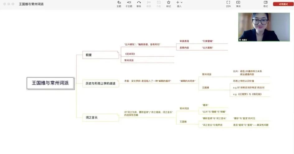 接下来,包嘉仪围绕王国维与常州词派的关系对罗著第七、八两章做了导读。她认为第七章围绕“阐释的共同体”概念展开:常州词派是一个以中国传统释词手法——“比兴寄托”为基底的“阐释共同体”,通过“引类譬喻”和“美刺比兴”,以达到使词的内容能够摆脱纯粹“艳科”而达到社会历史诠释的目的;王国维因受到叔本华影响,处在常州词派这一“阐释的共同体”之外,他反对限定于特殊历史背景的“忧生念乱”,而赞同一种普遍意义上的、超越历史的“忧生忧世”,追求词表达一种形而上的“普遍意义上的本质的痛苦”。第八章则围绕王国维词话中“词之言长”说法与其“境界说”之间的矛盾展开辨析。如果说“词之言长”延续的是常州词派对词追求“要眇宜修”审美特质的认识的话,那么,这就恰与“境界说”中的“直观”要求相违背,这正是王国维取消这则词话的深层原因,由此也取消了“比兴寄托”所赖以存在的理论土壤。