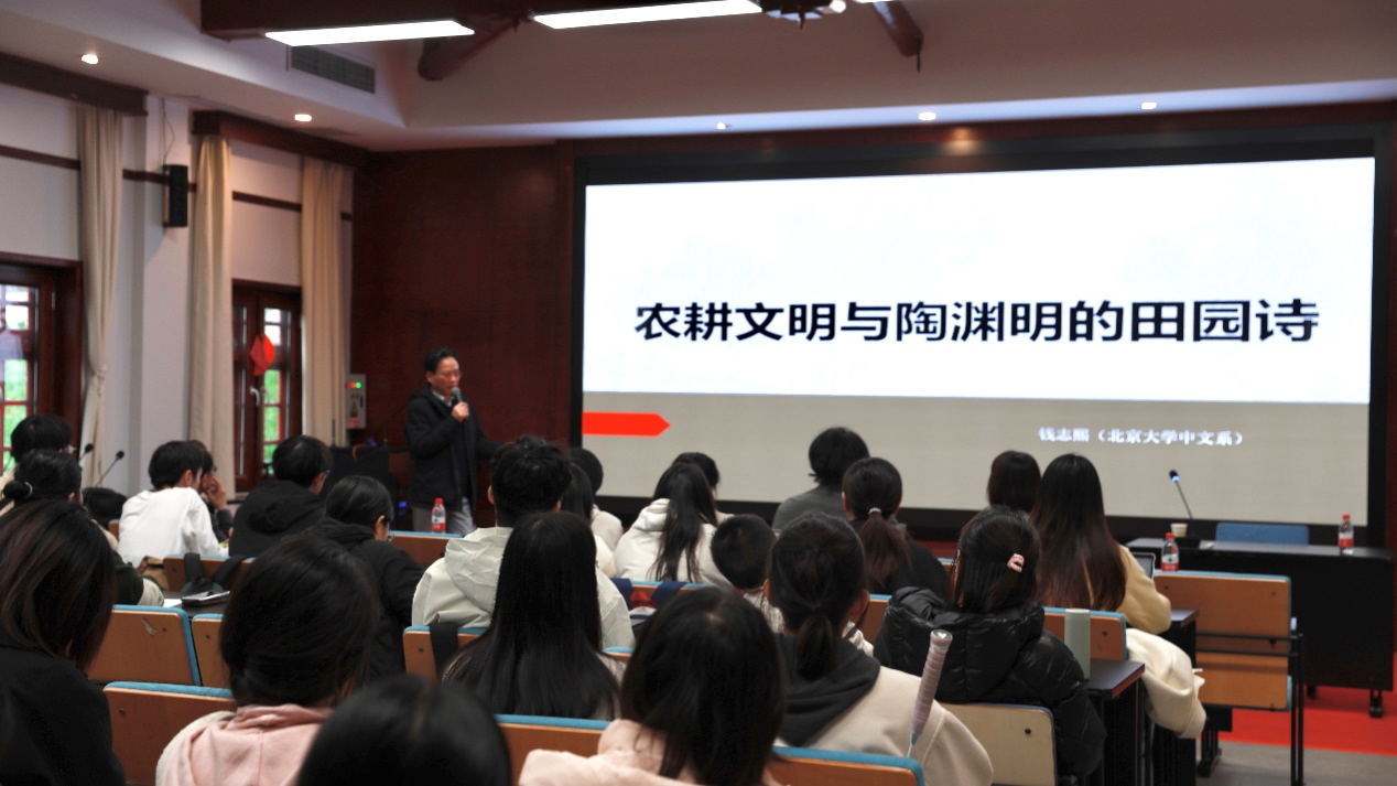 讲座伊始,钱志熙教授提纲挈领,指出农耕文明与士大夫文化的结合,是中国古代典型的田园文学产生的基本机制。虽然陶渊明的诗歌成就不限于田园诗,但田园诗的确最能代表陶渊明的独特风格及其在诗歌艺术上的创造。