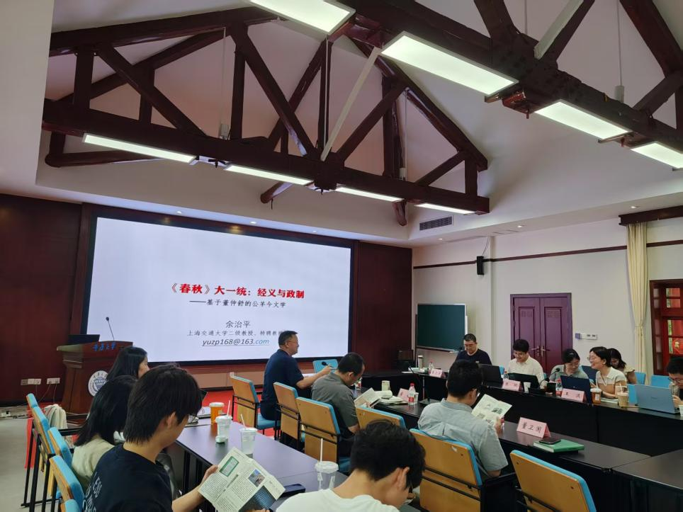 在评议环节,重庆大学哲学系的张文涛老师充分肯定了余治平老师用一本书回答一个问题的治学态度,并邀请与会学者逐一发言。重庆大学哲学系的黄铭老师肯定了余老师对“亲亲”、“尊尊”与“文质”等经学核心问题的重视,并由此对春秋公羊学以“正五始”言“大一统”之“以天道正人道”的内在逻辑做出了正本清源的阐释。重庆大学哲学系的闫云老师就余老师关于大一统问题的思考进行了进一步探讨,并补充了从作为国家政体形成、天下统合的内在驱动力的文教来思考大一统问题的维度。西南政法大学哲学系的董卫国老师对余老师谈及的问题亦表示关切,他认为在进行古典思想阐释时,首先要回到原初文本中进行思考。同时,董老师指出,在儒家传统中,是政制奠基于伦常,而非把伦常政制化。重庆大学哲学系的王淇老师认为区分儒家大一统和法家大一统的精神实质,是十分必要的。继而,王老师提出政权与治权的分野如何确定,如何“寓封建于郡县之中”等问题。重庆大学历史学系的张帆老师十分赞赏余老师古今关照、经史结合的治学态度,并向余老师请教了先秦与汉代之间议题与思想之演变的历史动因。以历史作为思想与政制建构资源的传统缘何独兴盛于西汉?避免以结果为导向,今日我们应如何更好地权衡分封与郡县两种制度的利弊,乃至其结合的最优化呢?重庆大学历史学系的冉艳红老师基于自己对郡县制的研究,希望与余老师就郡县制于秦代前后功能上的变革、“统一”概念的古今演化进行进一步探讨。最后,重庆大学哲学系的张文涛老师就王道、王霸、贤贤、权力与教化、民主与民本、《春秋》中孔子所推崇的政制、本书的明暗线索等问题与余老师进行了交流。随后,余治平老师感谢大家的评议,并一一做了详细回复。