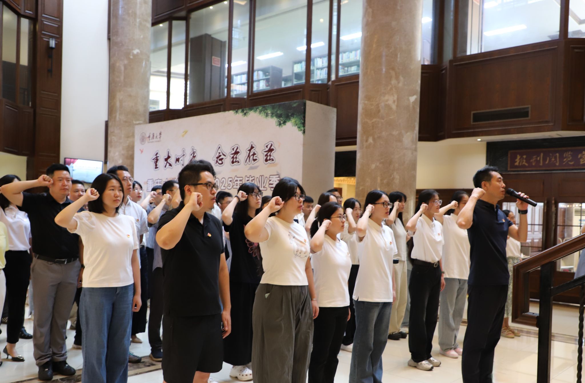党委副书记姜雪峰带领全体预备党员进行了入党宣誓、老党员重温入党誓词,党员们佩戴党徽,面向党旗高举右拳,在领誓人带领下庄严宣誓。字字千钧的誓言回荡在宣誓大厅,表达出全体党员对党的忠诚和为共产主义事业奋斗终身的坚定决心。
