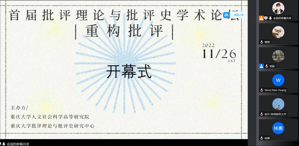 主办,重庆大学批评理论与批评史研究中心承办,邀请到了国内在文艺批评实践与研究领域深有研究的20余名专家学者出席,围绕“重构批评”主题展开了热烈研讨。来自全国各大高校众多师生在线上旁听了本次论坛。