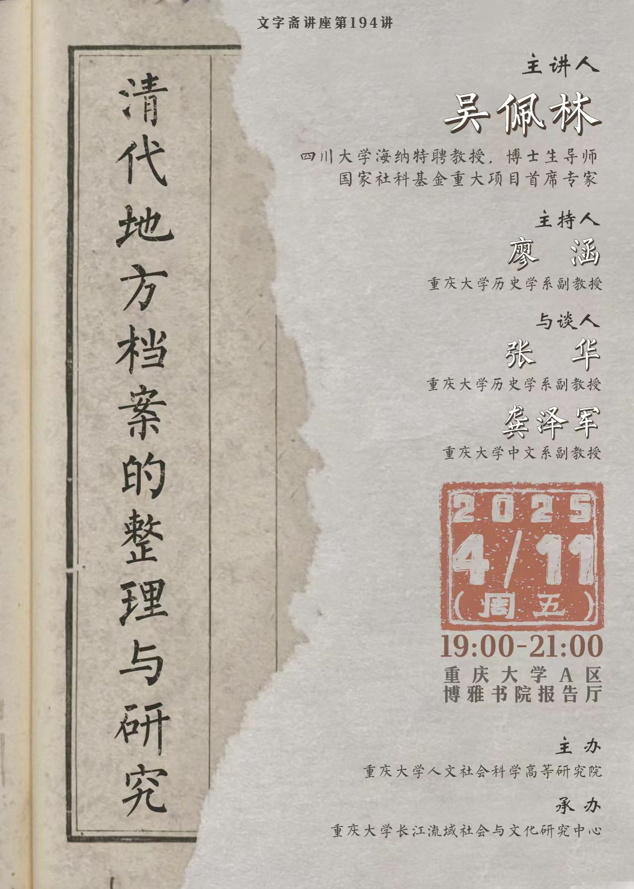 时间:2025年4月11日(星期五)19:00-21:00 地点:重庆大学A区博雅书院报告厅